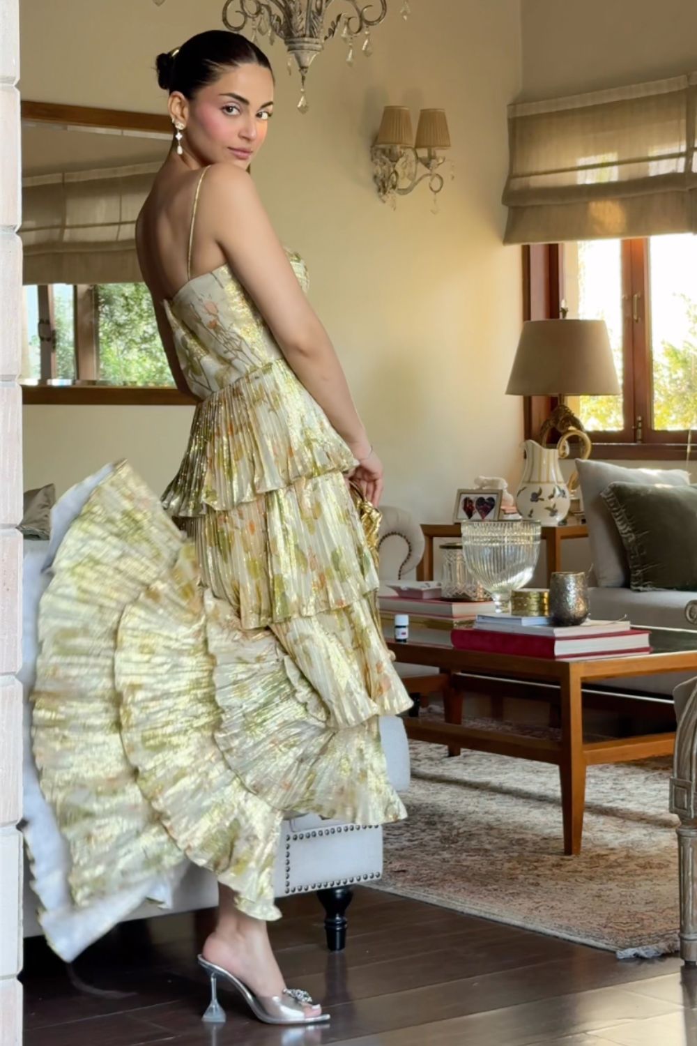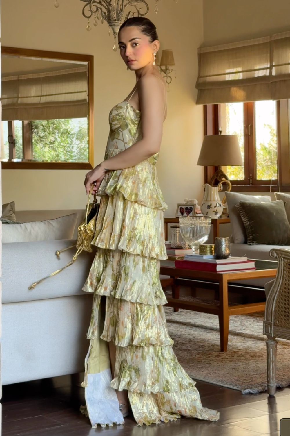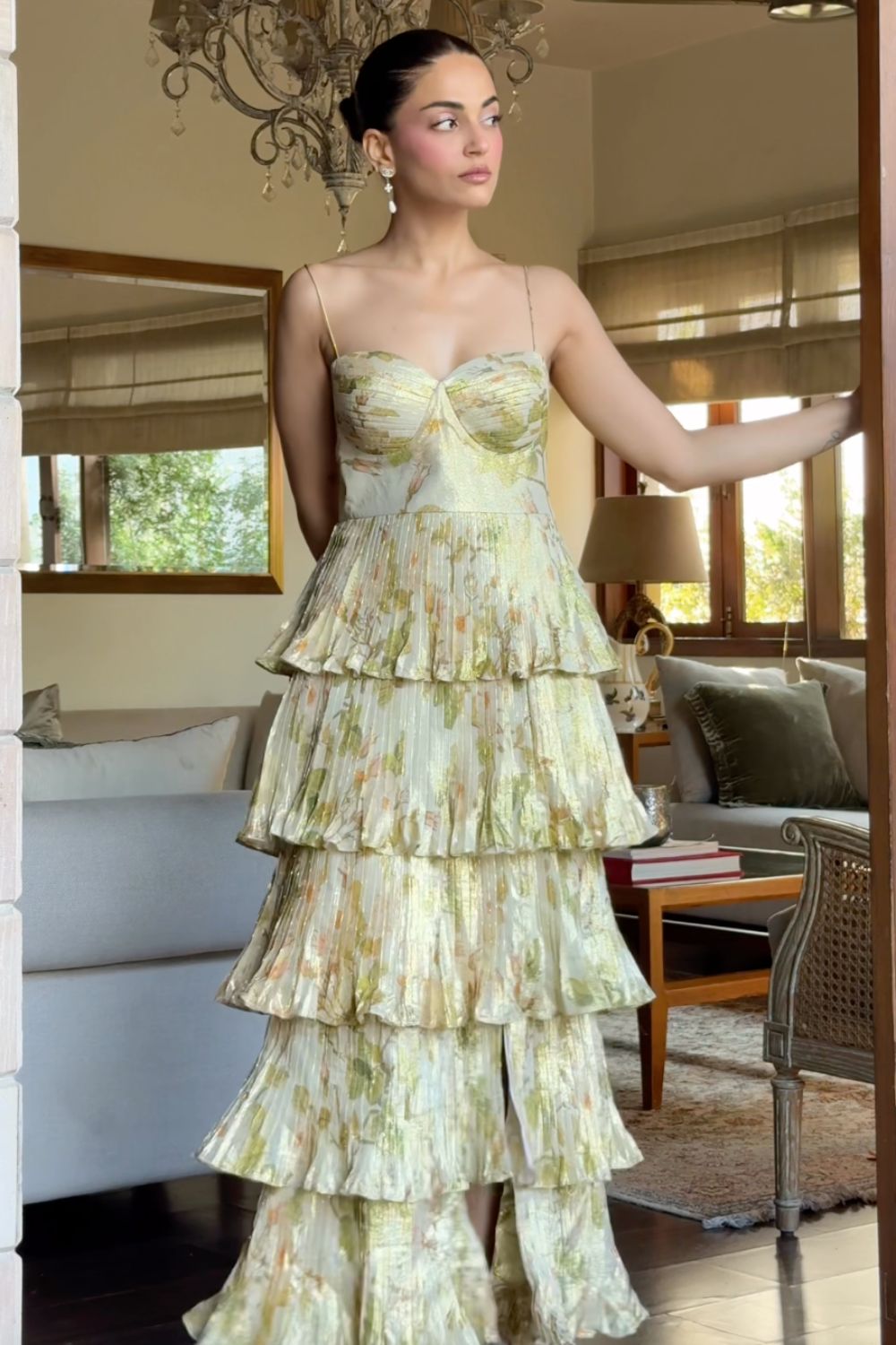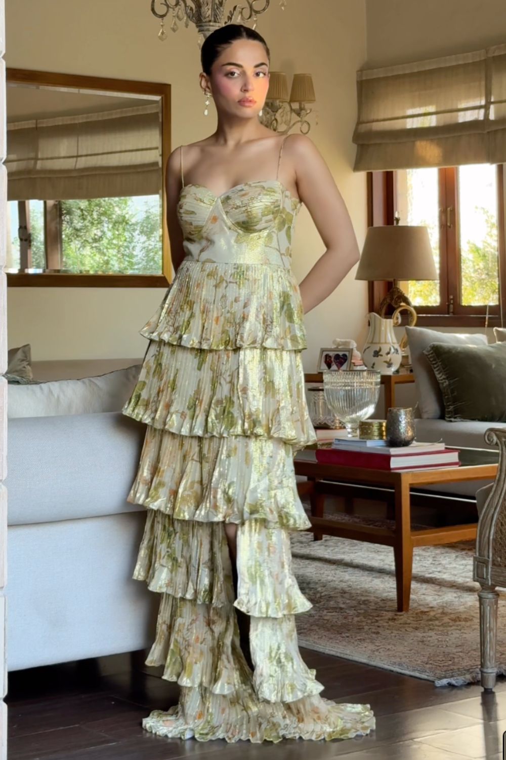 • Sweetheart neckline with structured bodice • Noodle Strap on shoulders • Multi layered Pleated ruffle skirt with side slit • Lightweight, pleated Lurex fabric with floral print • Floor-length with dramatic movement • Fully lined for comfort and coverage • Hidden side zipper for seamless fit