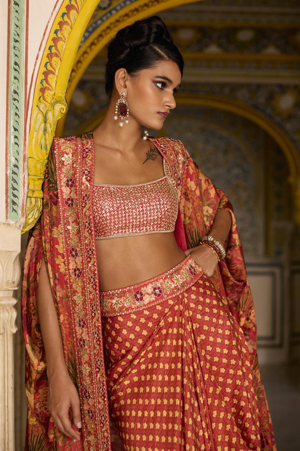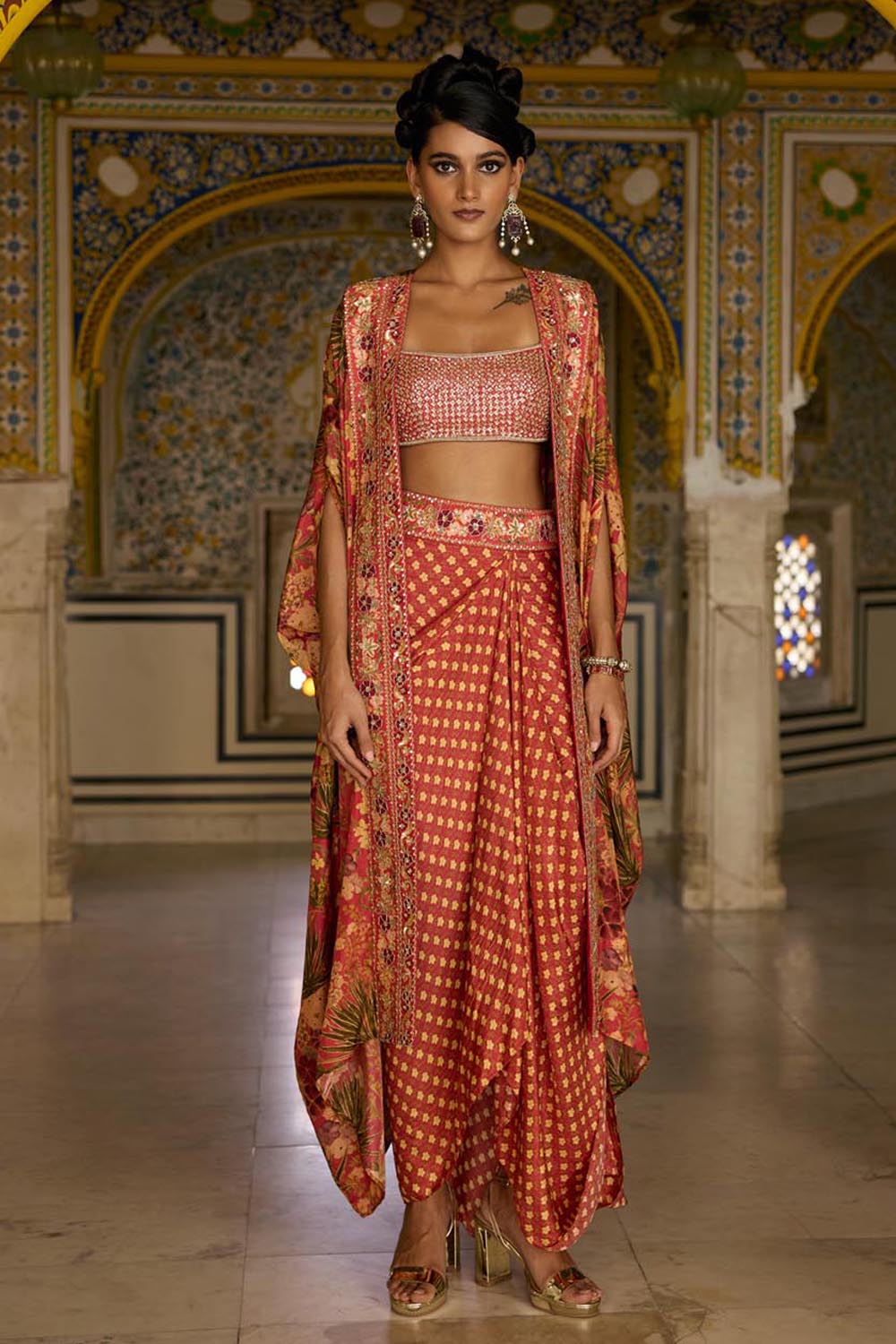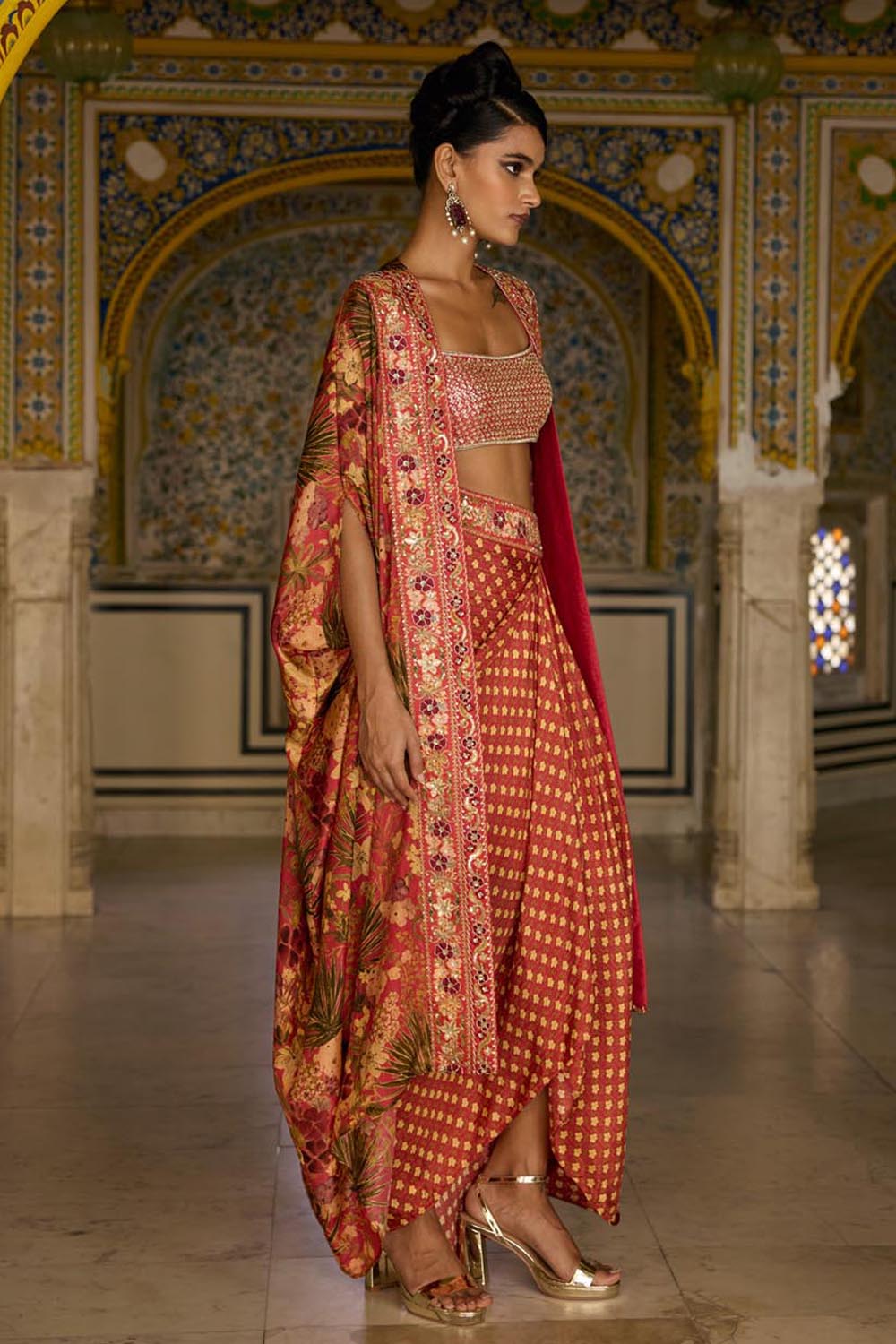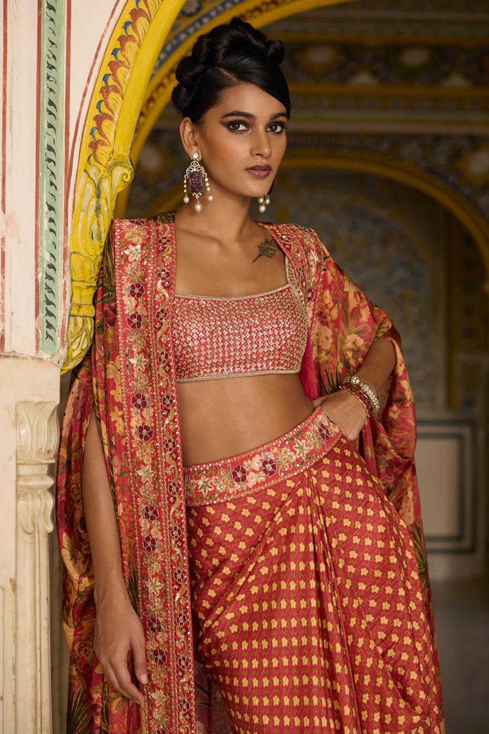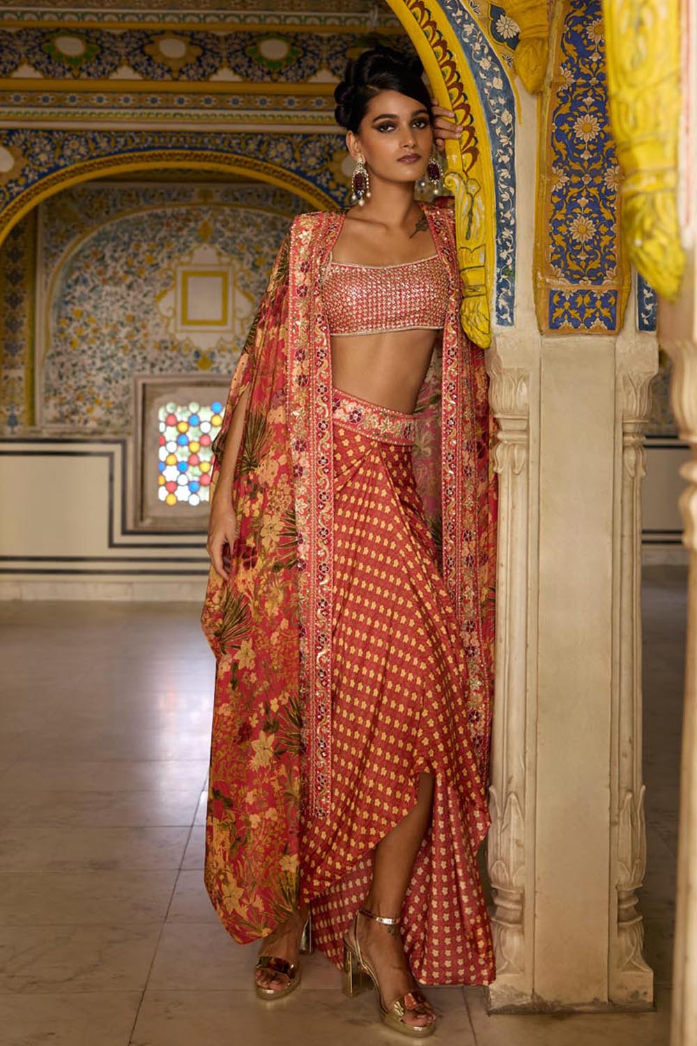 • Jacket is paired with an asymmetric drape skirt with embellished belt.