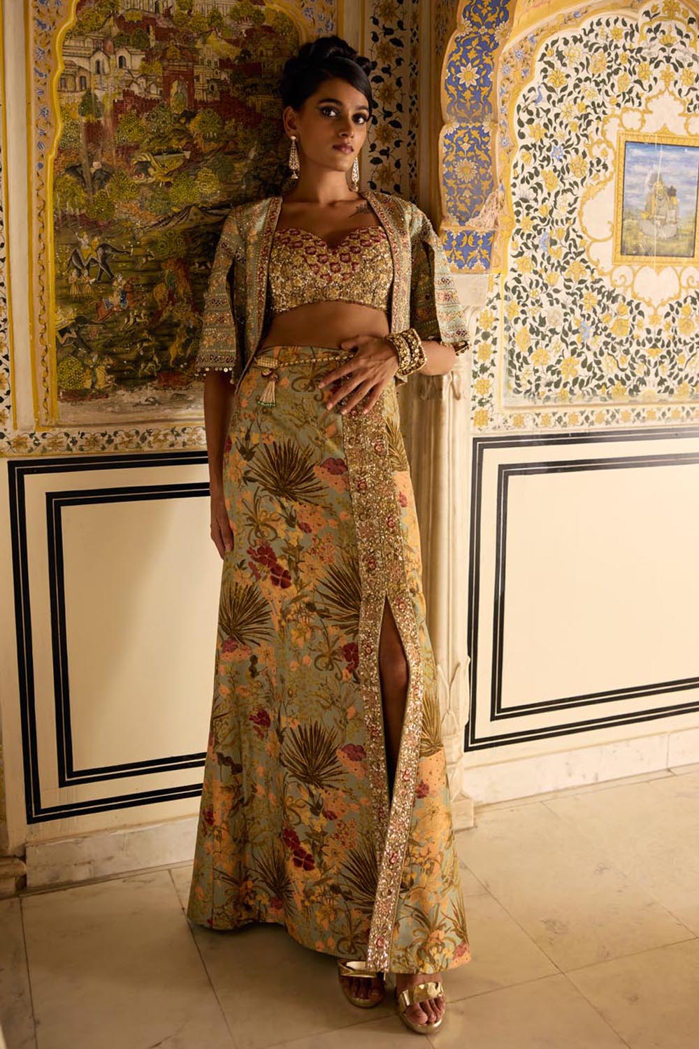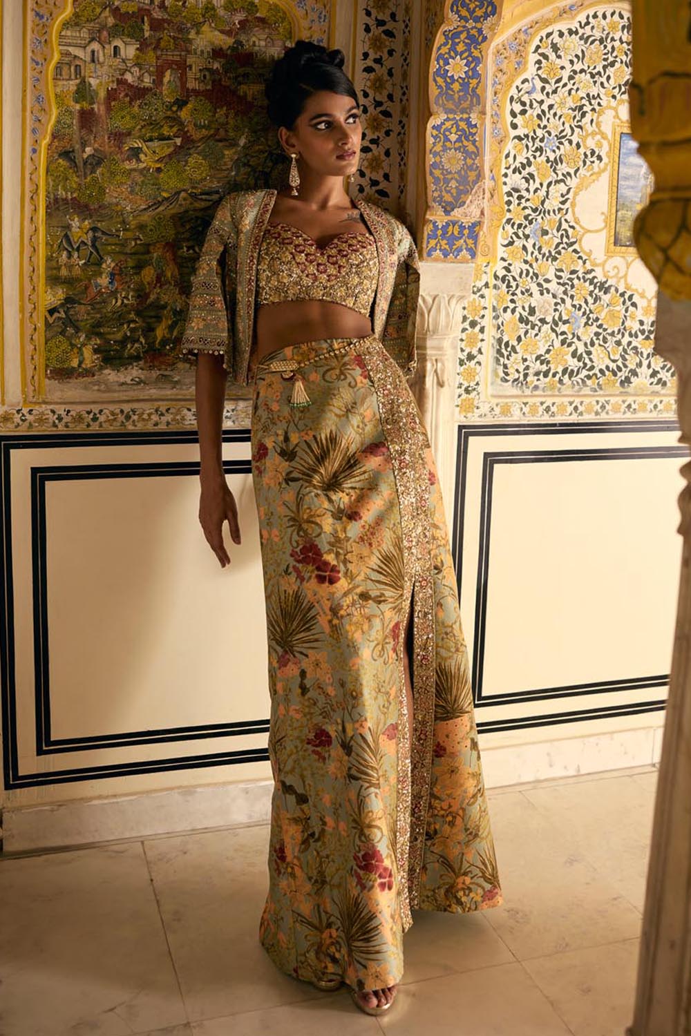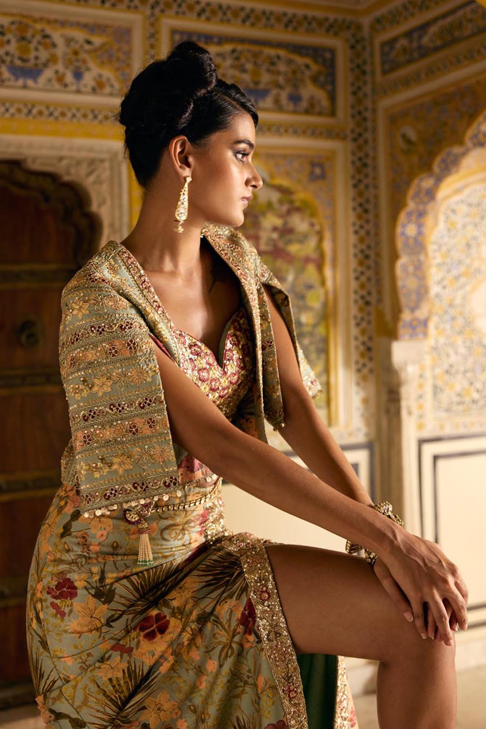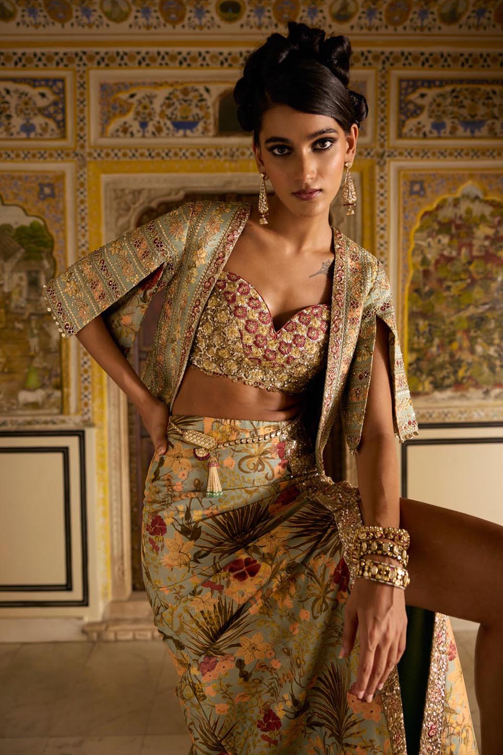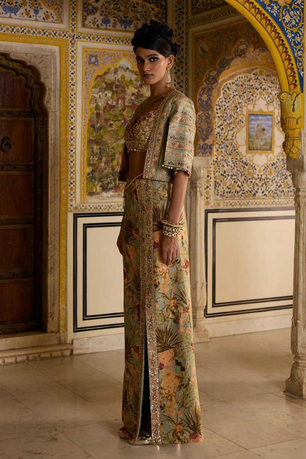 • Dusky blue short cape style jacket with embellished borders in sequins and beads.  Tassels on the sleeves hem