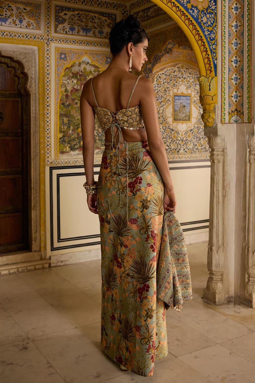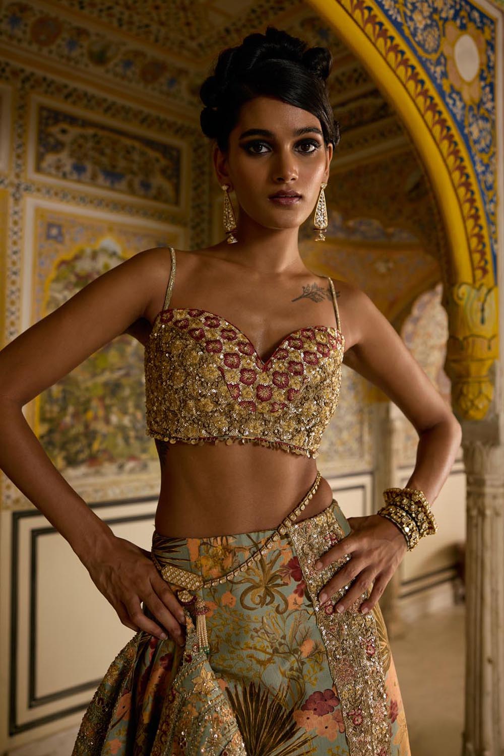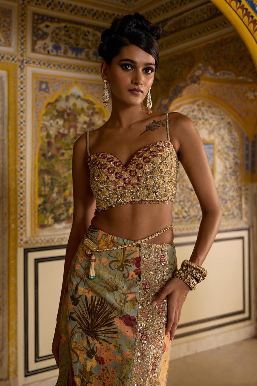• Sweetheart neckline blouse with noodle strap and all over sequins work. Tassel details at the hem and drawstrings at the back