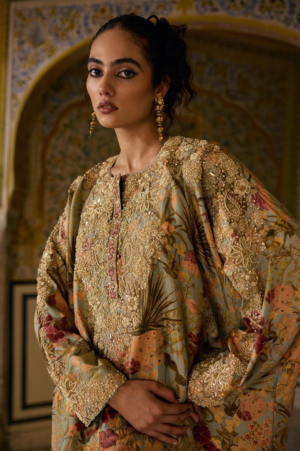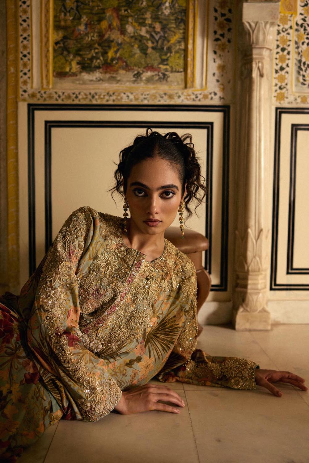 • Relaxed fit kurta with fully embroidered zardozi work on  neckline and sleeves. Embellished border on placket in the front.