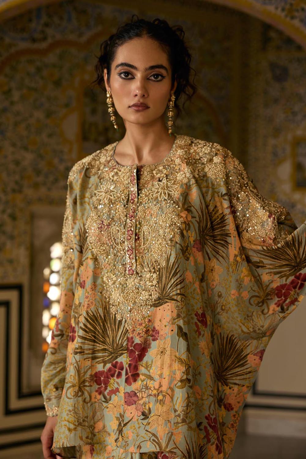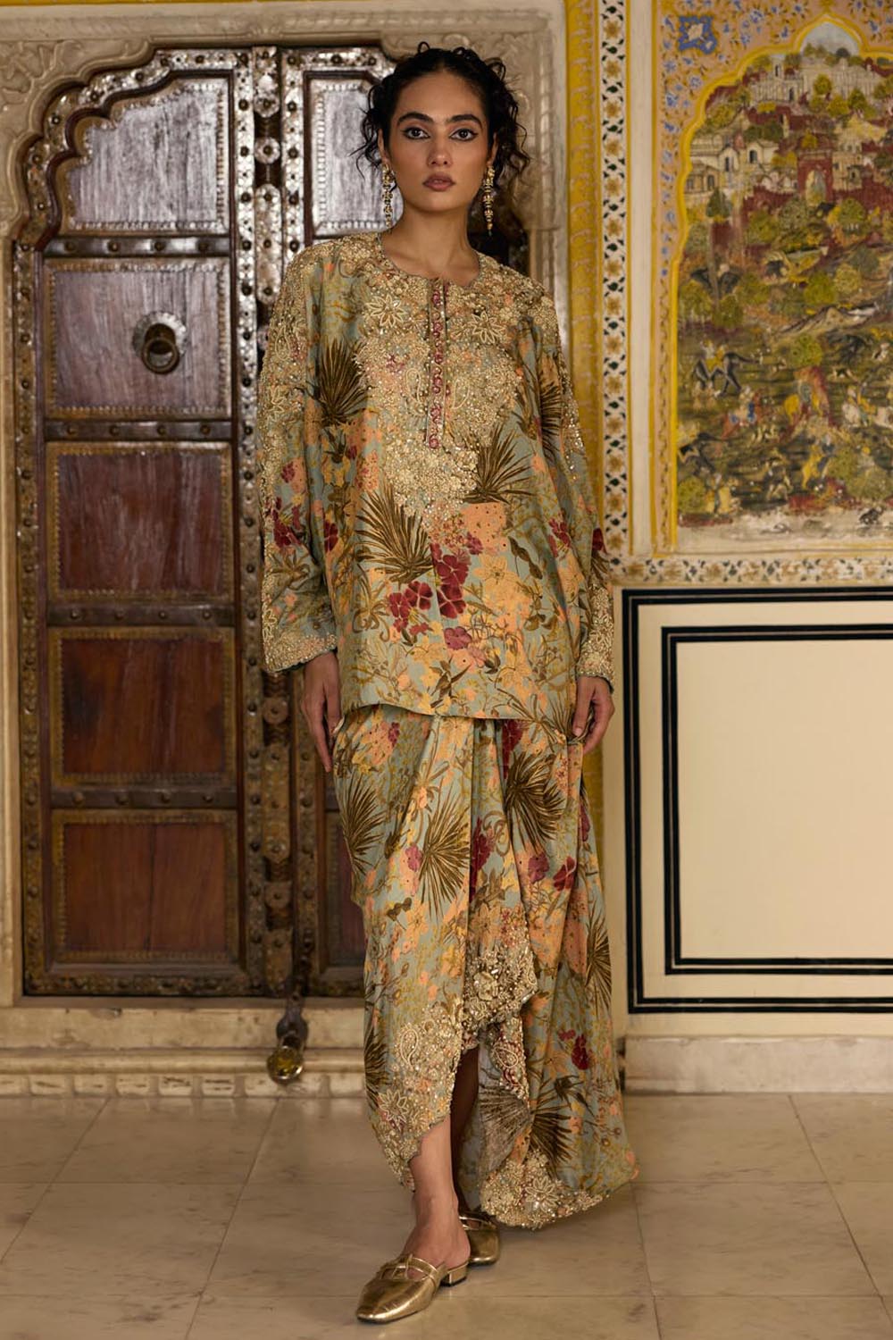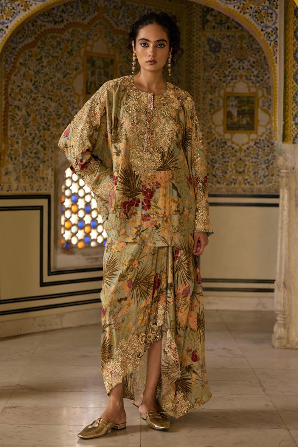 Embroidered Kaftan Style Kurta With Drape Skirt Set