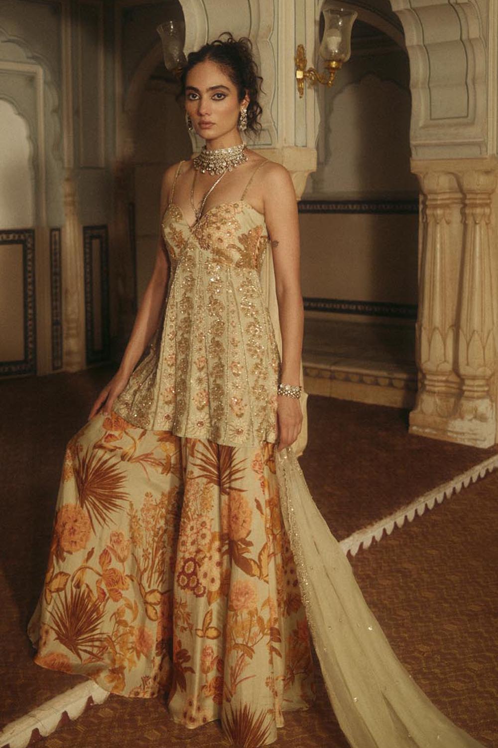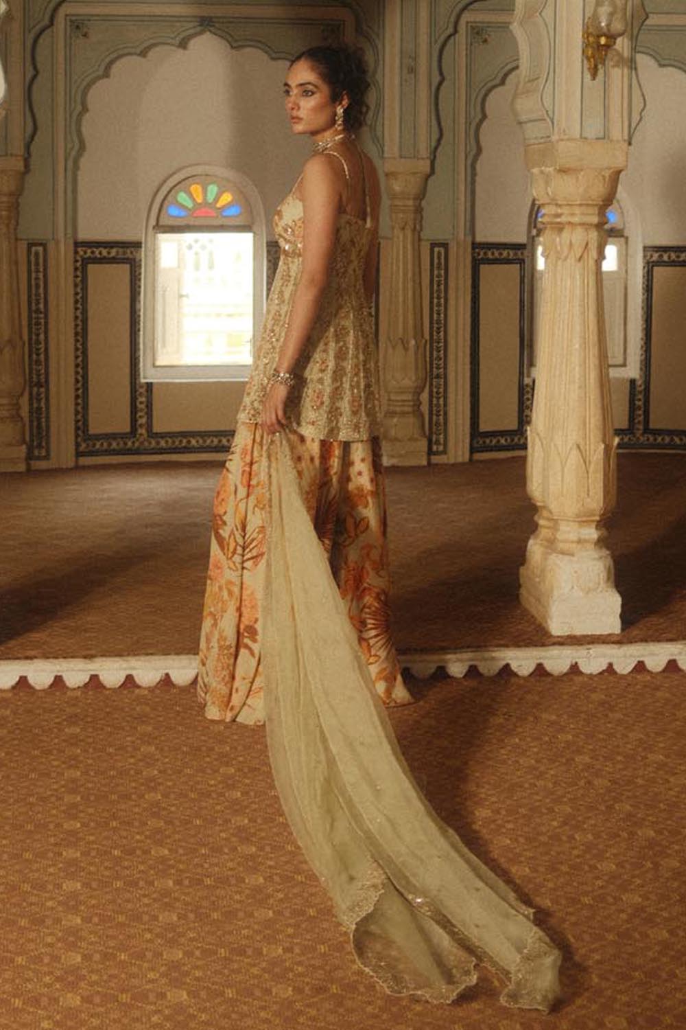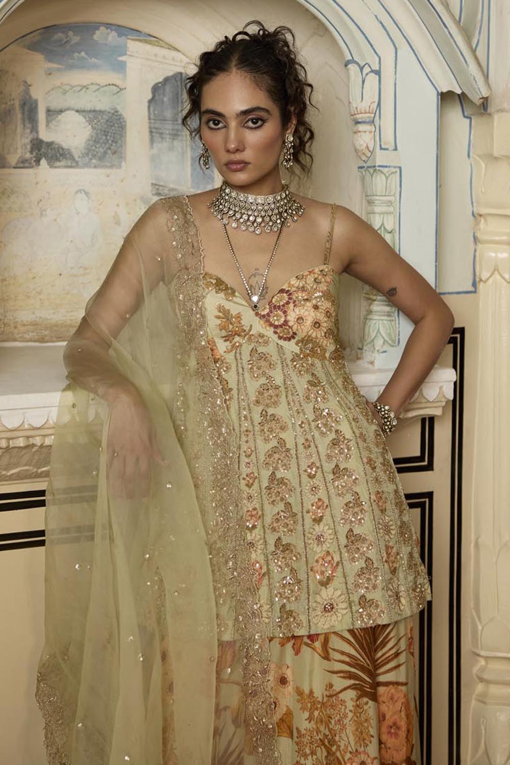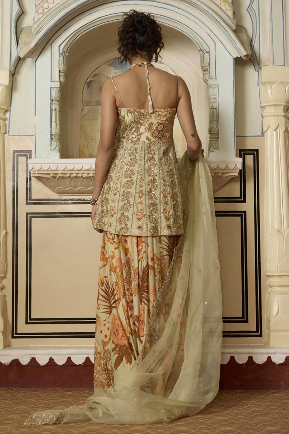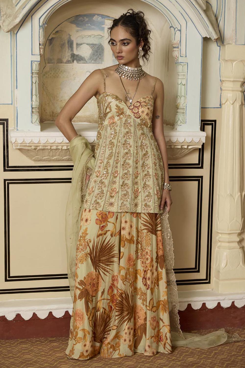 • Sweetheart neckline, straps and godet panels peplum top with sequins and cutdana hand embroidery all over.