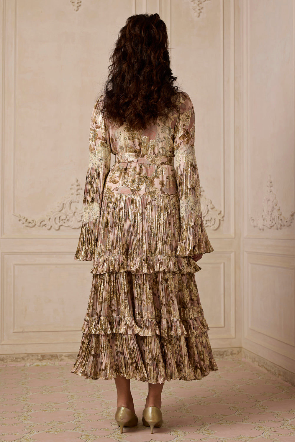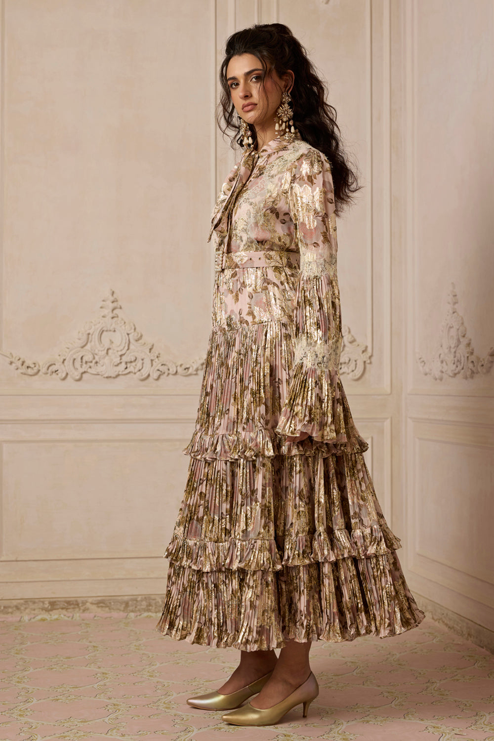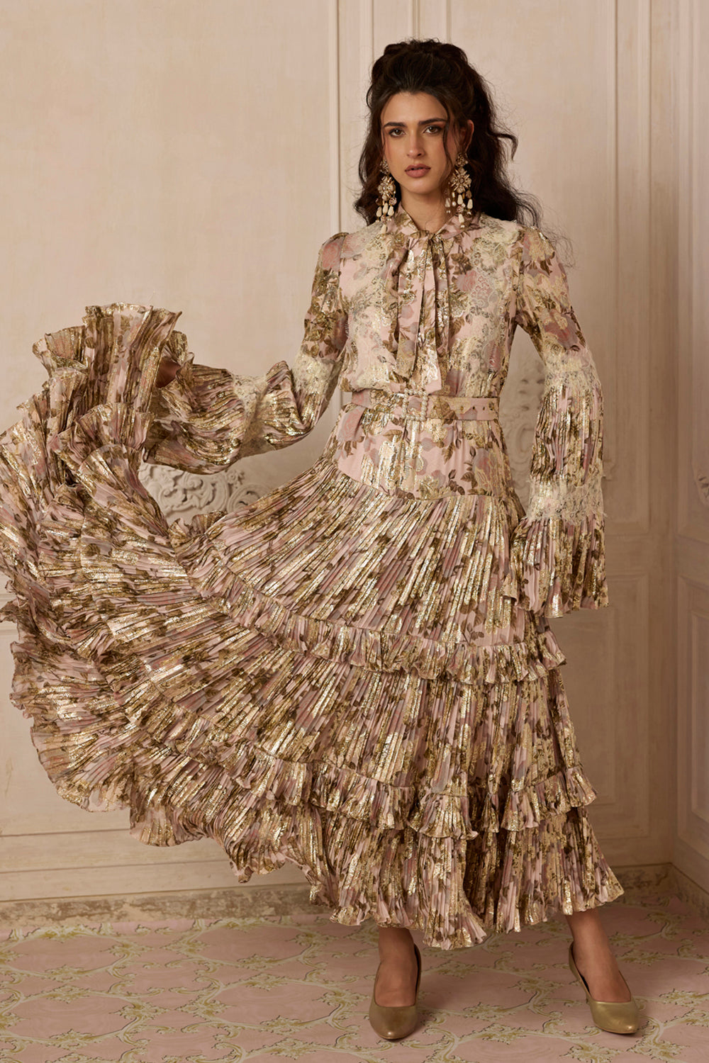 Fabric: Flat Chiffon Gold Lurex Stripes Lining: ShantoonNo. of items: 2Delivery Time: 3-4 weeksCare: Dry Clean OnlyFor customisations you can reach us on whatsapp
