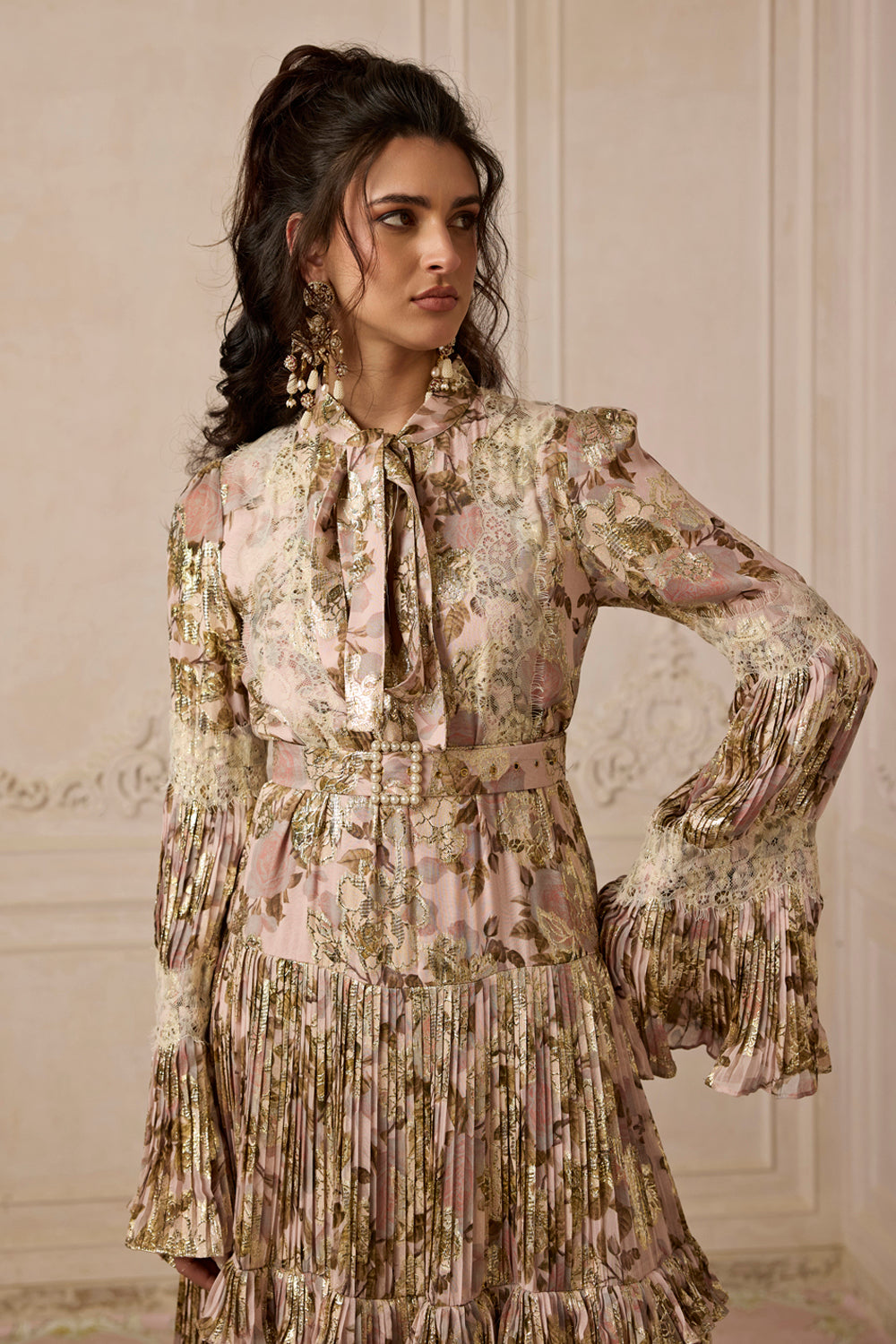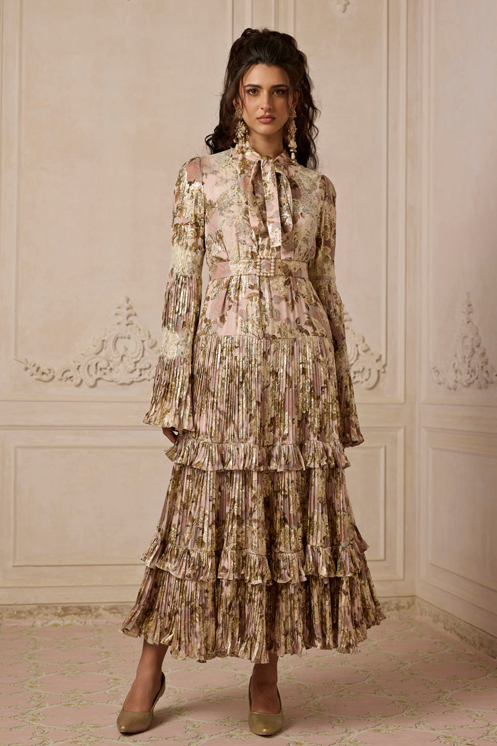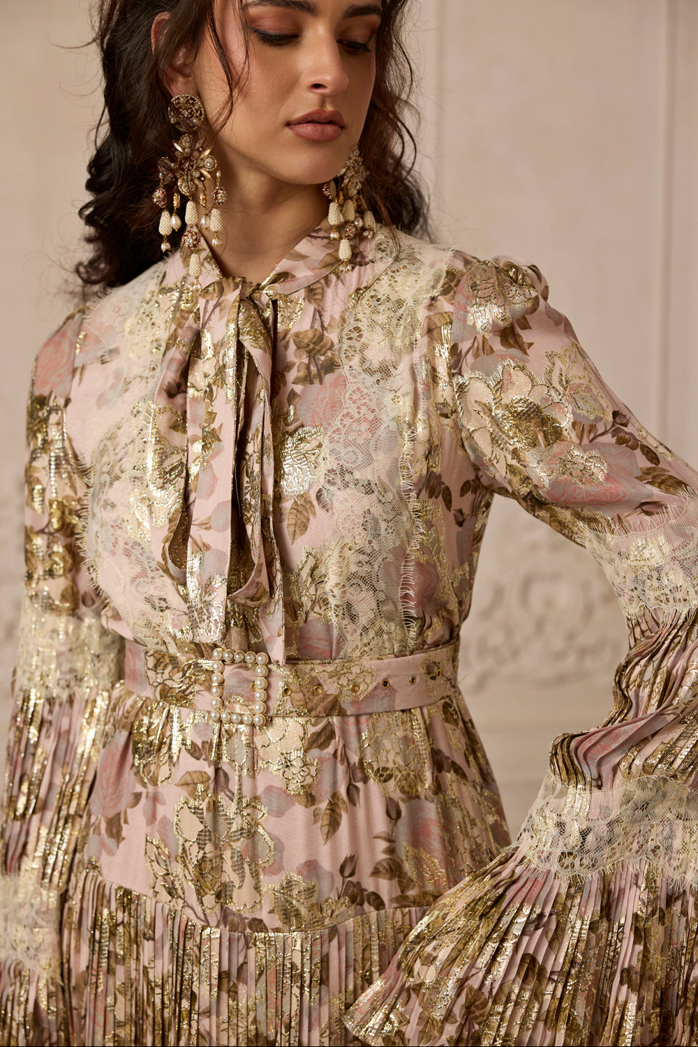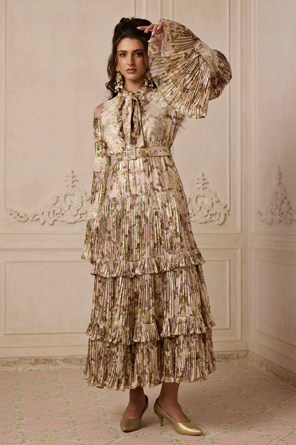 Fabric: Flat Chiffon Gold Lurex Stripes Lining: ShantoonNo. of items: 2Delivery Time: 3-4 weeksCare: Dry Clean OnlyFor customisations you can reach us on whatsapp
